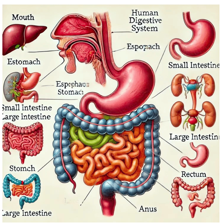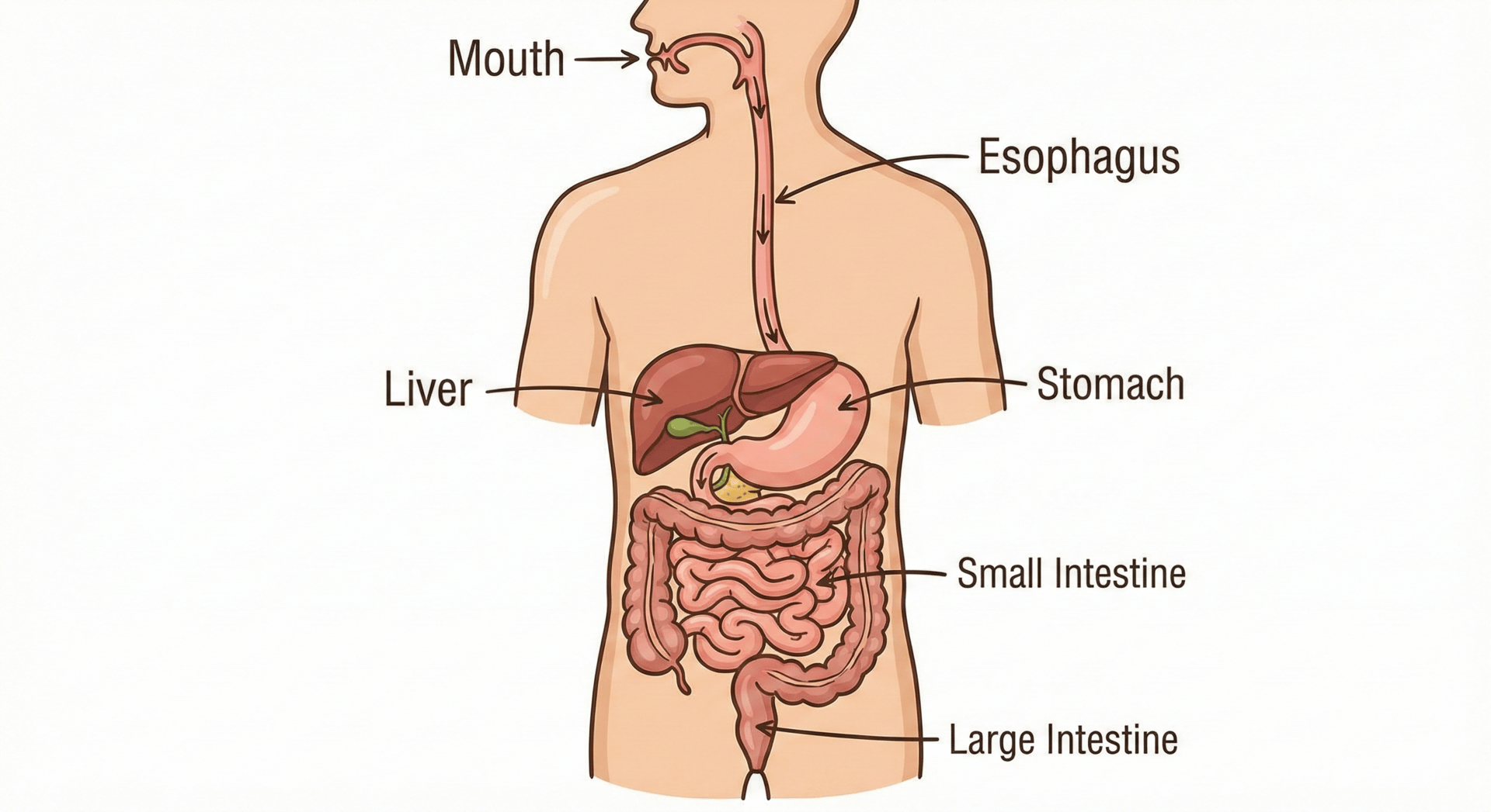 You are an expert illustrator for middle school science textbooks. Make me a labeled diagram of the human digestive system appropriate for 7th grade students, that includes the mouth, esophagus, stomach, liver, small intestine, and large intestine.