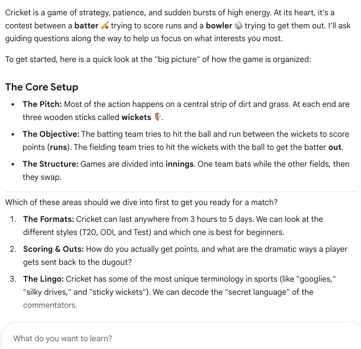 I started by thinking of a topic that I wish I knew more about. Several of my current students play cricket, but I don’t really understand the sport. So I turned on Guided learning and prompted Gemini,